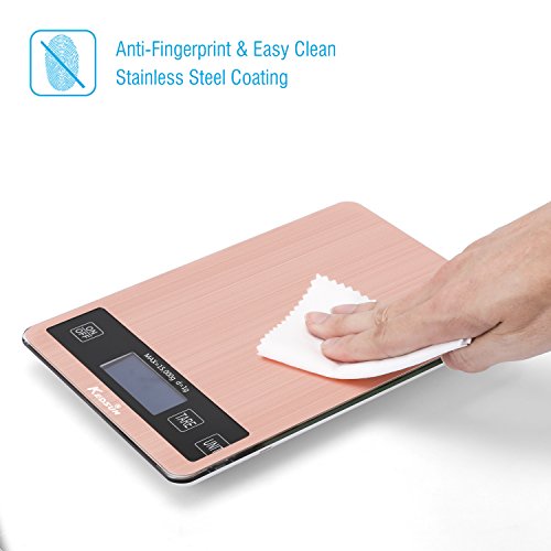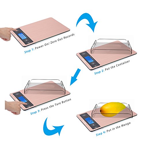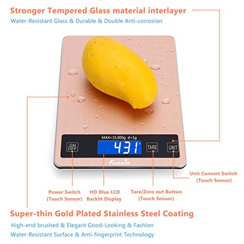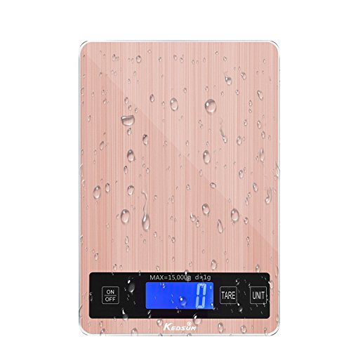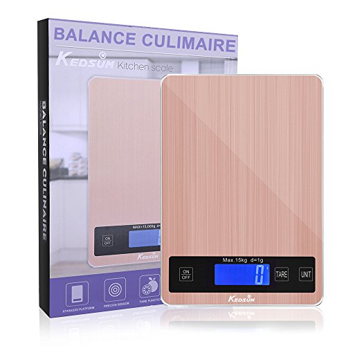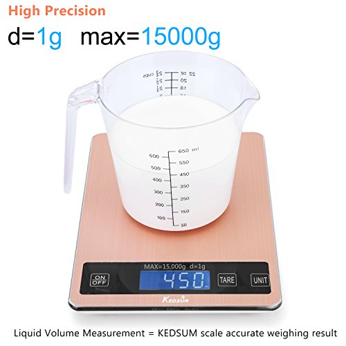 Features Accurate:KEDSUM digital kitchen food scale features 4 high precision strain gauge sensors to ensure more accurate weighing results, to deliver superior accuracy and the fastest response times for the quick placed chef. Stainless Steel: This compact kitchen scale features a high quality brushed chrome stainless steel platform and its modern design make the scale safe and fashionable. Easily Readable LCD Display: The screen features a bright LCD blue backlight with an improved viewing angle for the on-the-move chef. Low battery indication: When "LO" appears on the screen, indicates the battery is out of power, need to change the new batteries. Overload indication: "Err" shows on the screen, indicates overload. Tare Function: Also has Tare Function, which allows you to subtract the weight of an empty container or tray for net weighing determination. No More Miscalculations! Multi-function: Perfect for weighing your ingredients and know exactly how many ounces(or grams) you are dealing with. Can be used as coffee scale as well, the scale has a 15000g capacity. Auto power off: Can be turned off automatically after inactivity of 120 seconds.