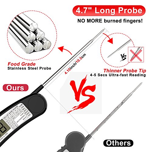 ❈Long Stainless Steel Probe: The digital food thermometer has 4.7" long probe which made of food grade stainless steel material, easy to test your grilling steak, boiling water, hot milk or BBQ meat and no worry about burning your fingers;