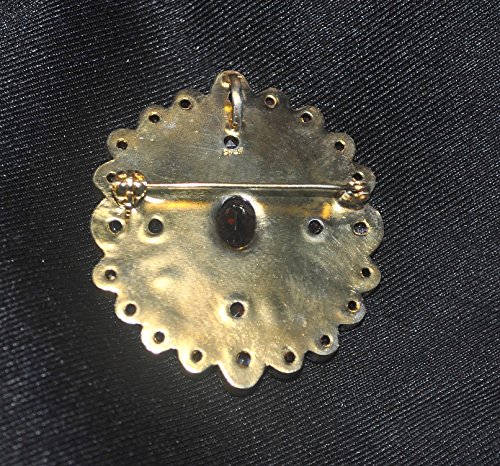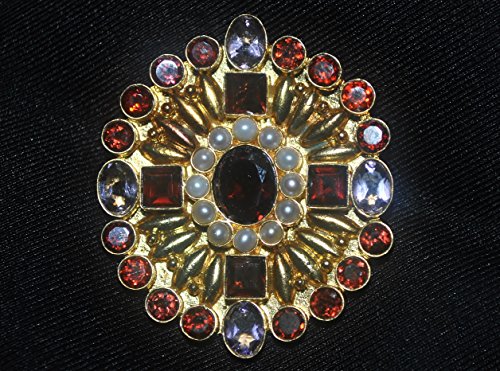 -. Feature : Made of .925 sterling plated with gold and set with stunning garnets, amethyst and seed pearls / About 1 3/4" inches tall x 1 1/2" wide / Antiqued, reproduction setting