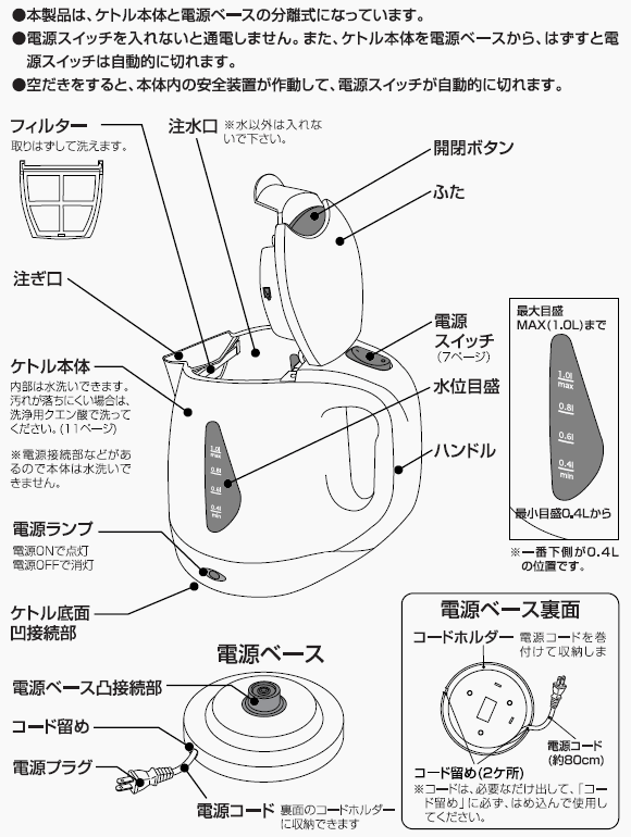 ●便利なコードレスケトル●ON/OFFスイッチとパイロットランプ●空焚き防止機能付き●沸いたら自動的に電源が切れるオートパワーオフ機能●水量が一目でわかる大型窓メモリー付きメーカー型番:GD-P101サイズ:W200×D143×H195mm重量:約775g生産国:中国商品仕様:電源コード:約80cm