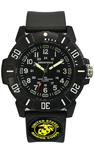 The AQUAFORCE MARINES ANALOG WATCH features a 45mm face and stainless steel metal back with a durable polyurethane strap. The face of the watch has luminous hour markers along with super luminous hands which only require 1 hour sunlight exposure to receive 6 hours of glow in the dark luminescence. The AQUAFORCE MARINES ANALOG WATCH is also Water Resistant to 50 Meters and all AQUAFORCE watches have a 2 year warranty. All watches use a high quality Japanese Quartz Movement.