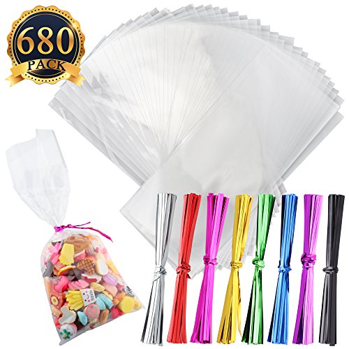 320 Pack Clear Treat Bags Clear Cello Bags With 360 Pieces Twist Ties 8 Colors For Wedding Cookie Gift Candy Buffet Supply (4 x 9 Inches)