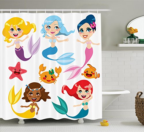 Mermaid Decor Shower Curtain Set By Ambesonne, Collection Of Cute Colorful Mermaids And Sea Friends Kids Cheering Joyful, Bathroom Accessories, 69W X 70L Inches
