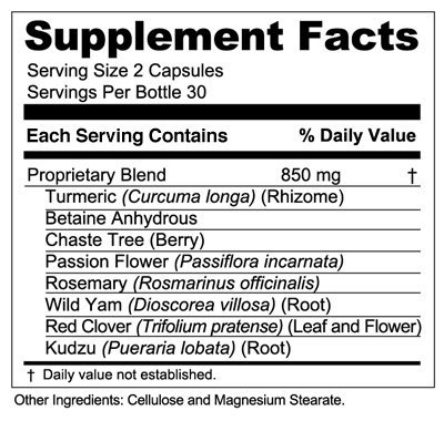 CONTAINS PROVEN NUTRIENTS in therapeutic dosages to show balance on female hormones. Includes Turmeric, Chaste Tree, Passion Flower, Betaine Anhydrous, Rosemary, Wild Yam, Red Clover & Kudzu