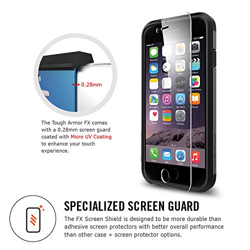 The Tough Armor FX takes tough a step further for the iPhone 6. An added lock-in screen shield fits snugly in the case without the adhesive to guard the screen for overall protection of the device. Air Cushion Technology and a patterned TPU incasing absorb and disperse shock for intense fortification against drops. A Micro UV coating on the screen shield preserves screen responsiveness to deliver supreme protection and unhindered functionality for a happier phone and a happier you.Feature