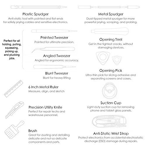 - Most Economical Do-Everything Tool Kit - Tools include 60 in 1 screwdriver set, utility knife, metal ruler, lcd suction cup with sim card ejector pin, anti-static wrist strap, anti-static tweezers, plastic opening tools, plastic spudgers, metal spudgers, triangle plectrums, clean cloth and brush.