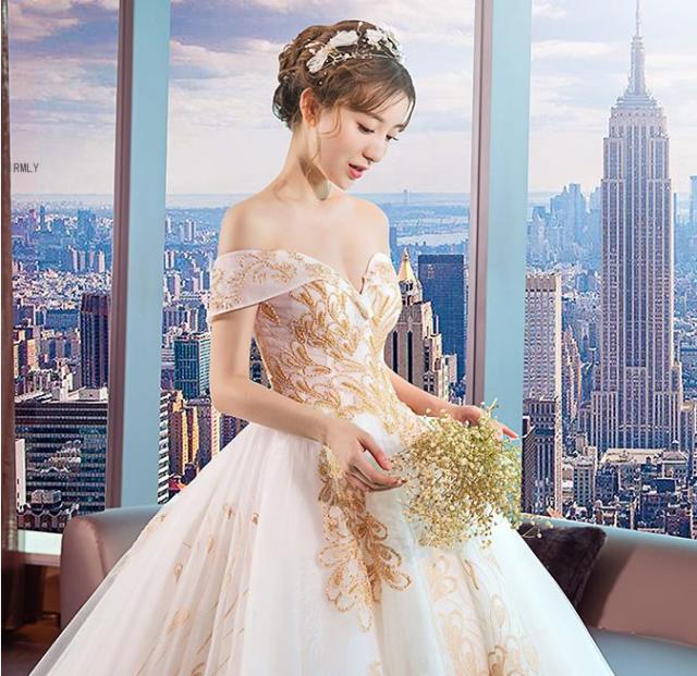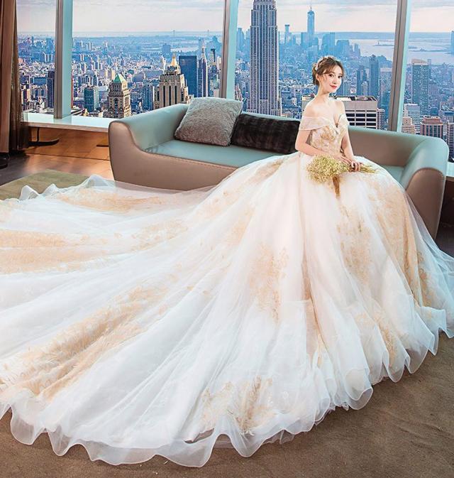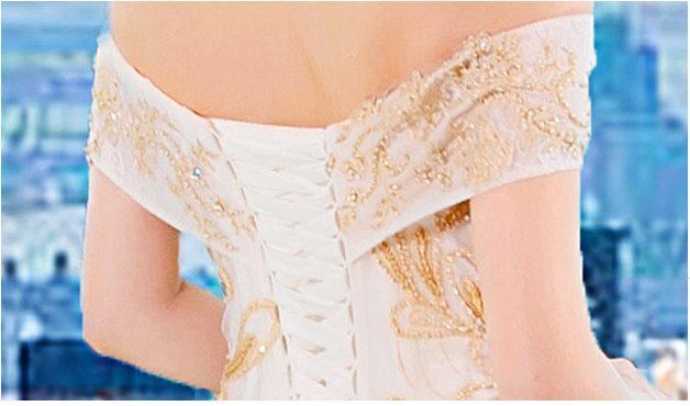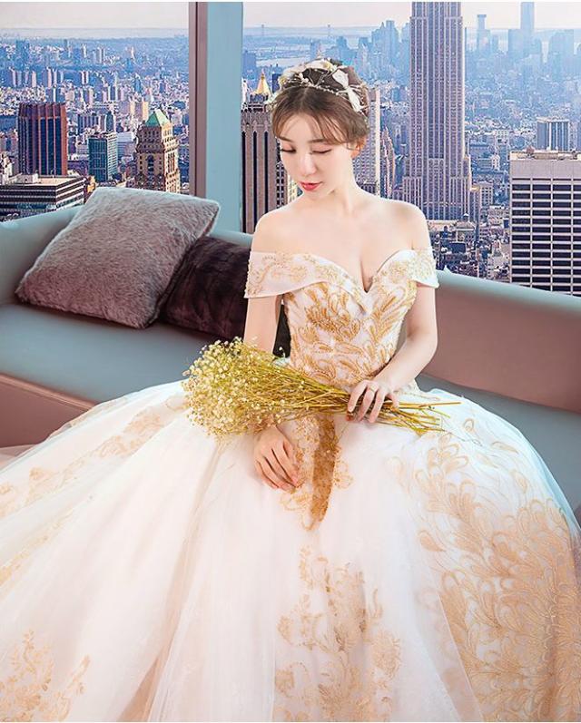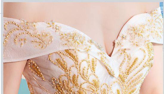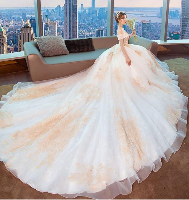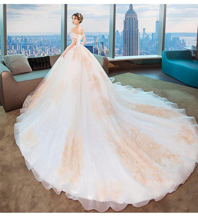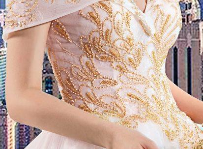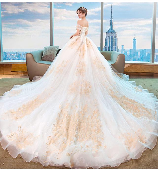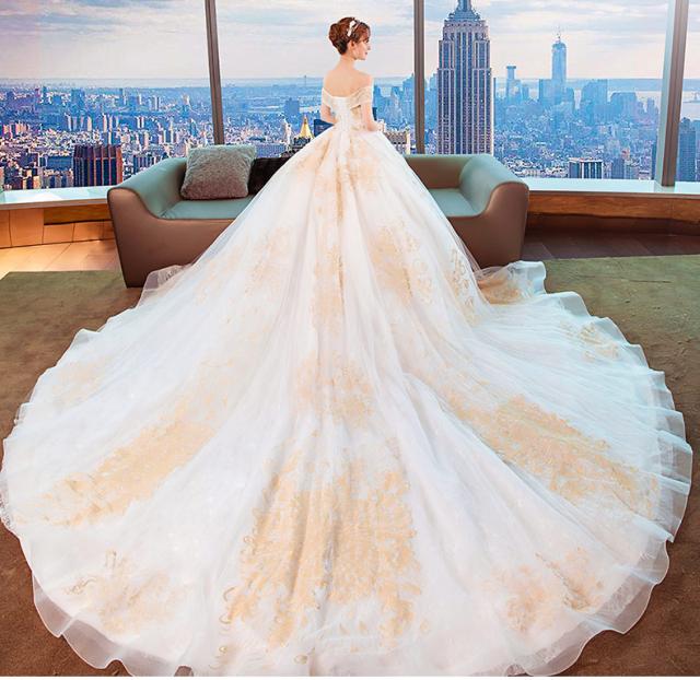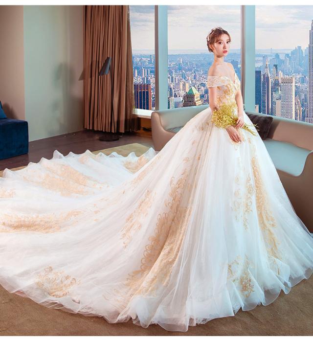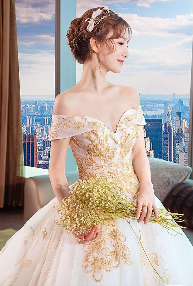 ゴールド刺繍をトップから裾まで施したオフショルダーウェディングドレス。