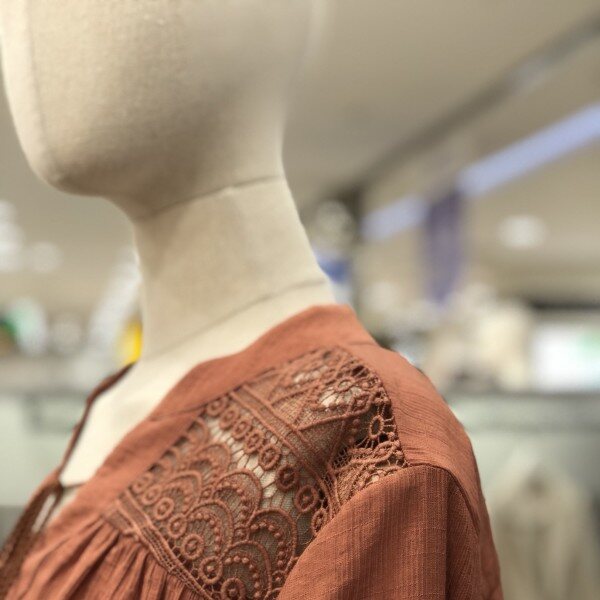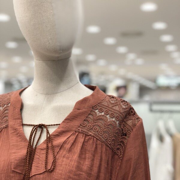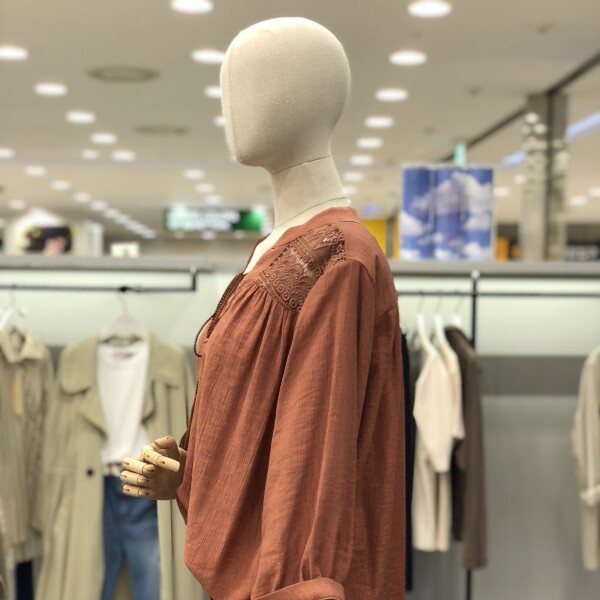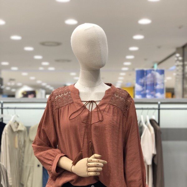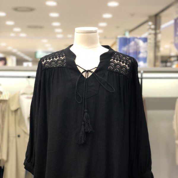레이스 배색 블라우스 입니다"소매 볼?감이 우아하며서 넥라인을 여성스럽게 연출할수 있는 아이템 입니다 데님팬츠와도 잘어울리며 스커트와 매치하여 오피스룩으로도 매치하기 좋습니다