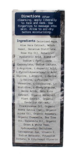 Men's facial toner for added effectiveness. What it does? This hydration toner is a perfect companion to follow a cleanser and prep for a moisturizer. The organic and natural blend first removes excess oil and dirt missed with a cleanser, then scrappy peptides (amino acids that penetrate the skin's layers) jump-start collagen production and open pores for antioxidants (like Vitamins C & E) and sugars to initiate natural hydration. What's under the hood: This botanical blend will calm and tone the skin for firmness, feel and color, so your skin looks fresh and healthy. Other key naturally and organically derived ingredients include Aloe Vera, Jojoba Oil, Witch Hazel and Rosemary. How to use it. Directions for use: Apply liberally on neck and face. Use your fingers to spread. Warning: For external use only.Feature