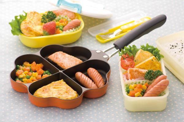 仕切りがあるので、お弁当作りに便利なフライパンです。ハート型を使ってデザート作りの型としてもお使い頂けます。また内面フッ素樹脂加工なので焦げ付きにくく、お手入れ簡単です。 |