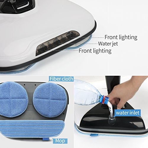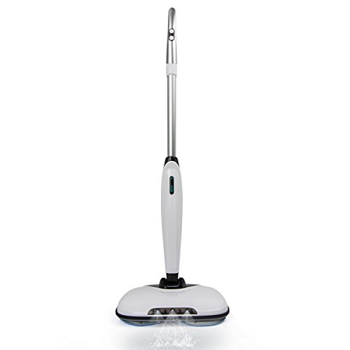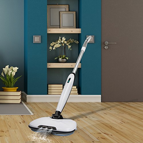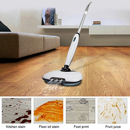 -. Feature : Cordless Spin Cleaning - The latest generation automatic floor cleaning machine with cordless design, provide no space limits quickly floor cleaning for you. Act as a super great floor cleaning helper for the hard flat floor surfaces like the hardwood, vinyl, tiles, marble and more floor types. / 360°Scrubbing and Mopping: 2 packs front round mop and 1 back long mop, all-around cleaning the floor without any dirt leave out. Mop type: cotton mop and scouring pads (please don't use the scouring pads on the hardwood floor).Led light for cleaning the corner or dark places. / The power scrubber is equipped with LED screen to display the power and error code. Very easy to use or maintain. Comfortable handle is detachable and the water tank with leakage-proof safe technology. Sturdy construction makes it work on the straight line and won't sway from side to side like other brand items. / Powerful battery with 2 speed level: Original Samsung LI-ION 2.0AH durable battery with 2 spin level to meet your different cleaning needs. High speed is 290 RMP and low speed is 200RMP. 35-45 minutes working time for a full charging (about 2.5 hours). / Item comes with 1 year free warranty. Warm tips: Please don't use the scouring pads on the wood floor. Please keep the cleaner away from the kids.