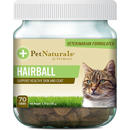 -. Binding : Misc. -. Brand : Pet Naturals of VT -. Feature : Formulated by veterinarians / Hairball for Cats is a natural supplement that contains no mineral oils or herbs / Hairball for Cats does not act like a laxative or lubricant / Hairball is free of corn, wheat and artificial ingredients / 70 Easy to administer chicken liver flavored chews -. Label : Pet Naturals of VT -. Manufacturer : Pet Naturals of VT -. PackageQuantity : 1 -. ProductGroup : Pet Products -. ProductTypeName : PET_SUPPLIES -. Publisher : Pet Naturals of VT -. Size : 70 Count -. Studio : Pet Naturals of VT -. Title : Pet Naturals of VT Hairball Supplements for Cats (70 count)