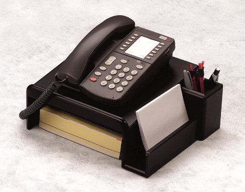 - Feature : This desktop phone stand holds any telephone up to 9 3/4 Inches square on an angled top platform with a raised front edge. / The Wood Tones collection combines solid construction with the warmth of a natural wood grain look and softly rounded edges. / Base has non-skid feet to prevent desktop scratches. / Side compartment holds note pads and cards, and attached pencil cup keeps pens and pencils nearby. / 12.2 inches long by 9.94 inches wide by 4.85 inches high.