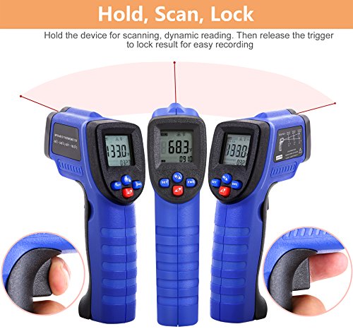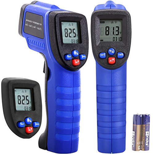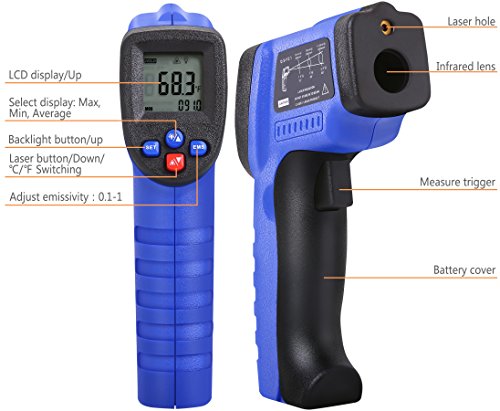 - ADJUSTABLE EMISSIVITY - Set the IR thermal sensor to read a variety of different surface materials. Useful thermometer to help find hot or cold spots in walls, insulation, heated objects or larger areas. You can also scan looking for MAX/MIN temperatures as you move the temperature laser gun across a larger target. Other features include an averaging function, high and low alarms are easily set so the laser thermometers will beep for readings below or above your preset thresholds.