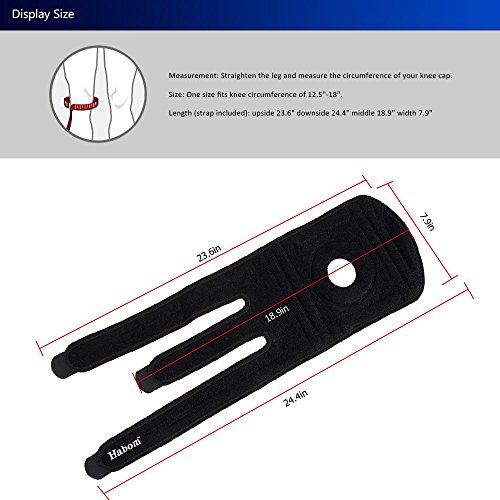 - 3 ADJUSTABLE COMPRESSION VELCRO adjust tightness to suit different individual needs. One size fits knee circumference of 12.5"-18" (31-46cm) for either leg.
