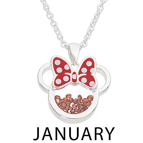 Official Licensed Disney Birthstone Women and Girls Jewelry Minnie Mouse Silver Plated Brass January Garnet Red Cubic Zirconia Shaker Pendant Necklace, 18+2" Extender