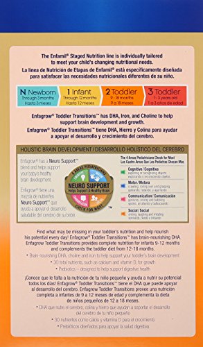 -. Binding : Health and Beauty -. Brand : Enfagrow -. EAN : 0300875102114 -. Feature : Nutritionally tailored for older infants and toddlers 9-18 months / Neuro Support blend has nutrients such as DHA, Iron and choline to help nourish the rapid brain growth that happens in the first three years. / Balanced nutrition - 30 total nutrients to help support healthy growth / Protein and calcium to help support active toddlers / Natural Defense Dual Prebiotics blend designed to help support digestive health -. Label : Mead Johnson & Company -. Manufacturer : Mead Johnson & Company -. PackageQuantity : 1 -. ProductGroup : Pantry -. ProductTypeName : HEALTH_PERSONAL_CARE -. Publisher : Mead Johnson & Company -. Studio : Mead Johnson & Company -. Title : Enfagrow Transitions Milk Drink for Toddler, 28 Ounce -. UPC : 300875102114