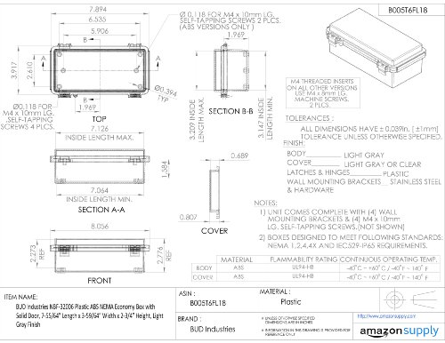 BUD Industries NBF-32006 Plastic ABS NEMA Economy Box with Solid Door, 7-55/64" Length x 3-59/64" Width x 2-3/4" Height, Light Gray Finish