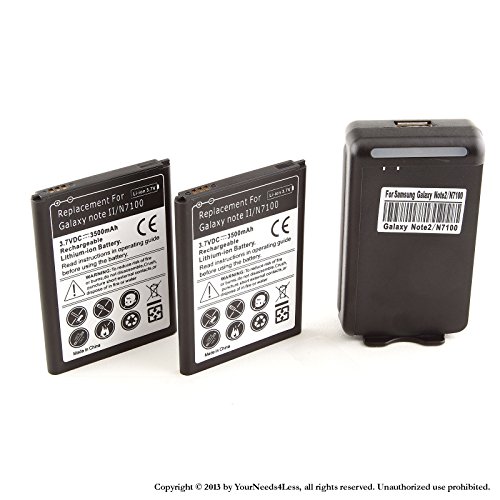 -. Feature : HIGH QUALITY BATTERY CELLS: This YN4L® Samsung Galaxy Note II 2 GT-N7100 battery is manufactured and tested under strict quality control standards. This Replacement Battery will provide you with up to 500 Lifetime Charge Cycles with a high-speed and efficient charge. Keep your phone powered with our high quality, rechargeable Lithium-Ion batteries. An excellent, high-quality replacement for your original battery. Great as a spare battery for long meetings, business trips, and vacations! / COMPATIBLE WITH: The YN4L® 3500mAh Samsung Galaxy Note II 2 GT-N7100 Battery is compatible with the Samsung Galaxy Note II 2 GT-N7100; SCH-I605(Verizon); SCH-R950(U.S. Cellular); SGH-I317 (AT&T); SGH-T889 (T-Mobile); SPH-L900 (SP.R.Int) / REPLACEMENT / SPARE / BACKUP BATTERY: Swap out your old battery with a brand New YN4L® Battery. With an Integrated microchip that prevents overcharging and lengthens battery life! / PACKAGE CONTENTS: 2 X YN4L® Replacement Batteries ; 1 X ARC® Wall Dock Charger / SATISFACTION GUARANTEED: If you are not 100% satisfied with your order, just let us know. Customer satisfaction is our #1 P.R.Iority. Be sure to buy from DealArmy for authentic items as they are the only authorized seller of YN4L® batteries on Amazon!