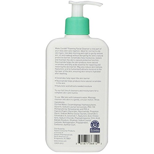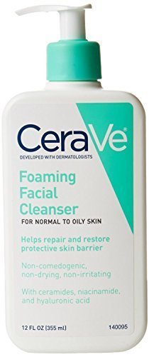 CeraVe foaming facial cleanser gently removes dirt, excess oil and dead skin cells to reveal a clean, fresh face. The non-irritating formula maintains a healthy moisture balance, never stripping the skin, while eliminating shiny, oily areas. Replenishing hyaluronic acid and ceramides produce a healthy skin barrier so your face feels comfortable without any tightness or dryness.Feature
