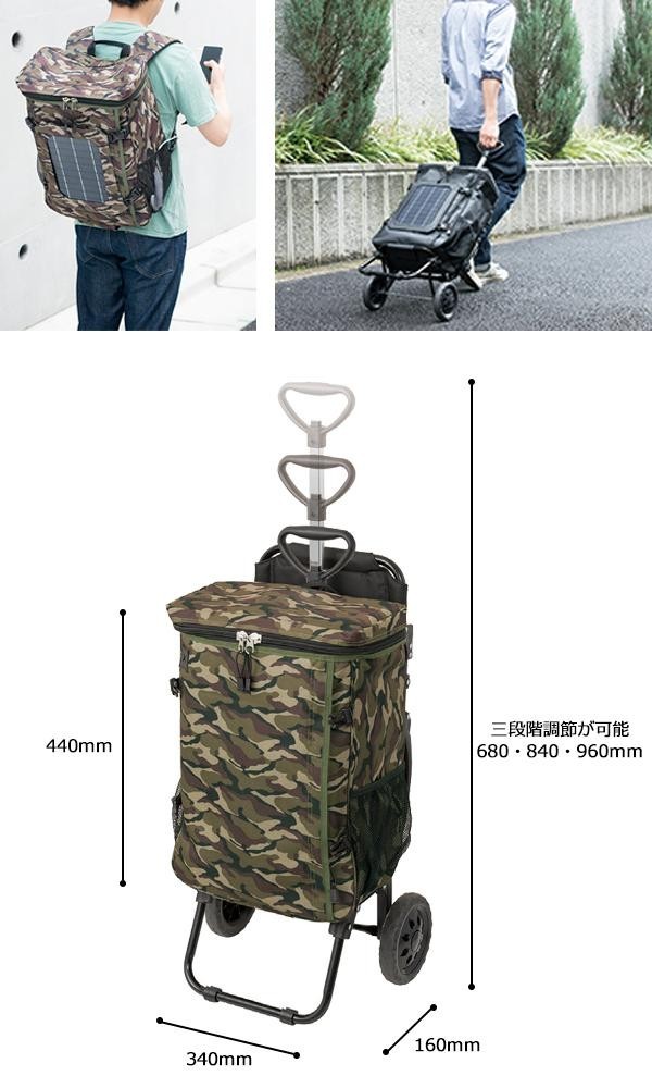 | ソーラーパネル付きチェアカート!!トレンドのスクエアタイプは、ビジネスシーンはもちろん、アウトドアやタウンユースにもピッタリです。取り出し口が大きく開いて出し入れがしやすい形です。機能的なポケットを沢山搭載しました!!※付属のモバイルバッテリーは使用条件、保管条件を超える環境では、本体が著しく劣化し、故障に至る可能性があります。ご注意ください。 |