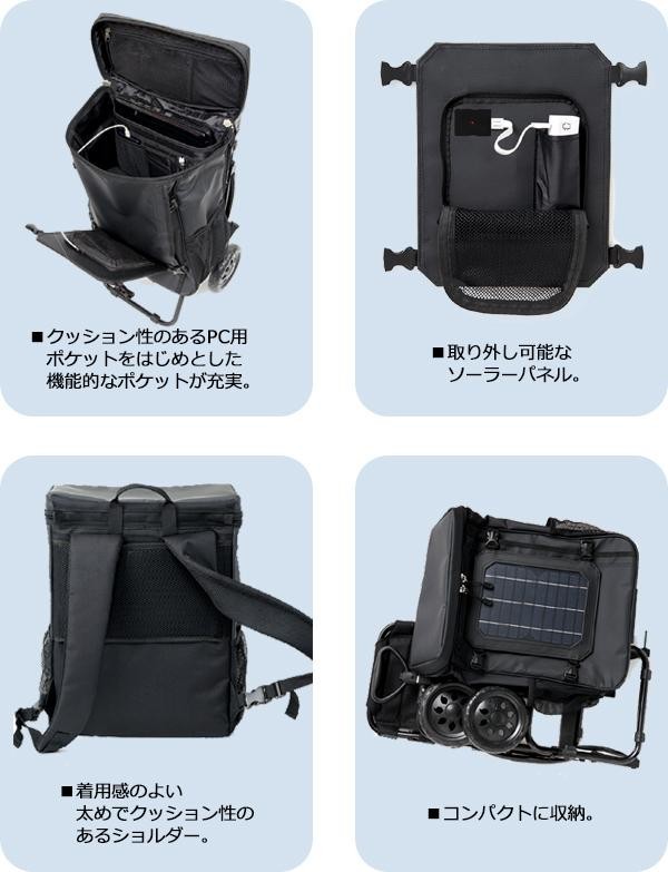 | 素材・材質 | フレーム:スチール バッグ表地:(ブラック)ポリ塩化ビニル100%、(ダークグリーン)ポリエステル100% バッグ裏地:ポリエステル100% 座面部分:ポリエステル100% PCポケットクッション材:発泡ポリエチレン(EPE) ソーラーパネル:EVA(エチレン酢酸ビニル共重合樹脂) |