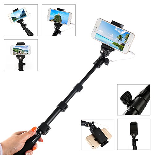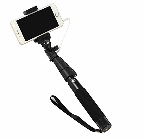 Wired Selfie Stick,KOMRT Professional High End Alloy Selfie Stick with Universal Phone Holder for iPhone 6 6s Plus 5s, Samsung Galaxy S5 Note 4 Note 5 Android (Black)