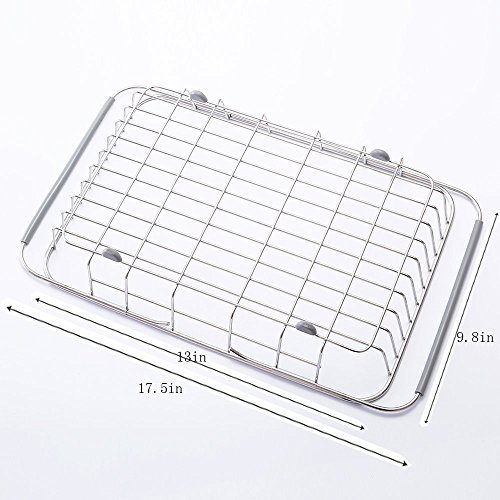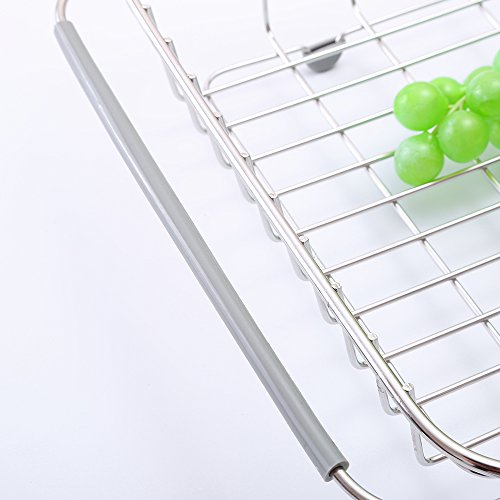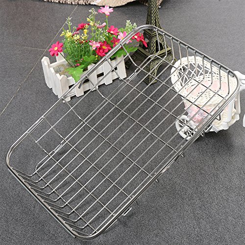- EASY STORAGE& SPACE SAVERING - Stainless steel dish rack with adjustable bars fits over the sink or on countertop and takes up only a fraction of the space, anti-skid extendable rubber arms keep the rack not fall down into the sink and four rubber-coated feet to protect your sink and counter from scratching perfectly.