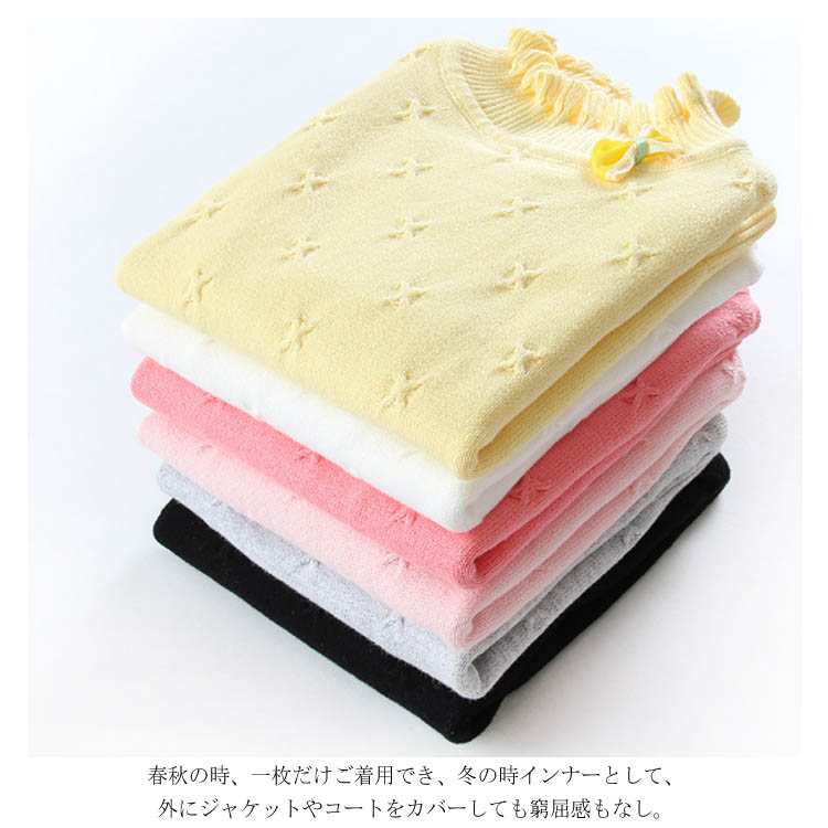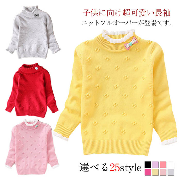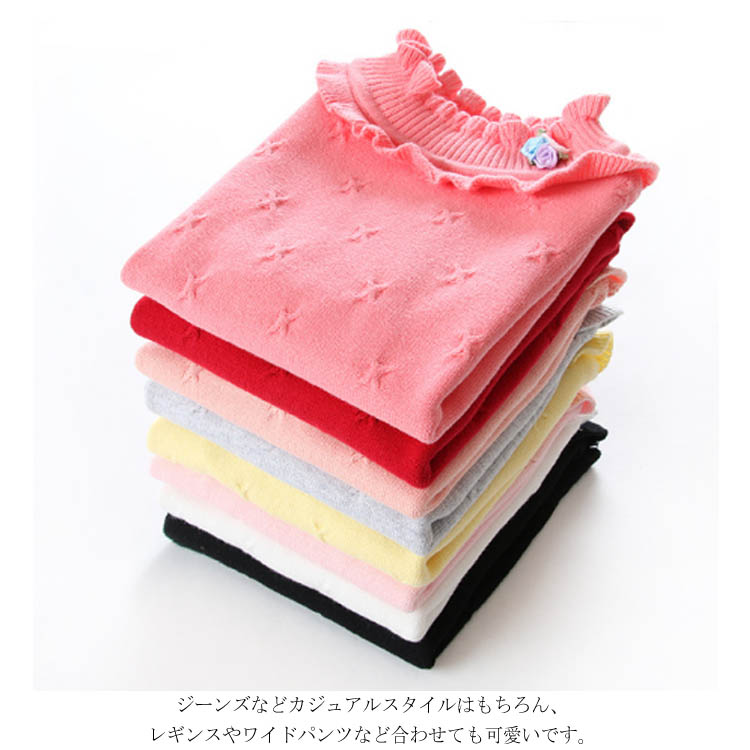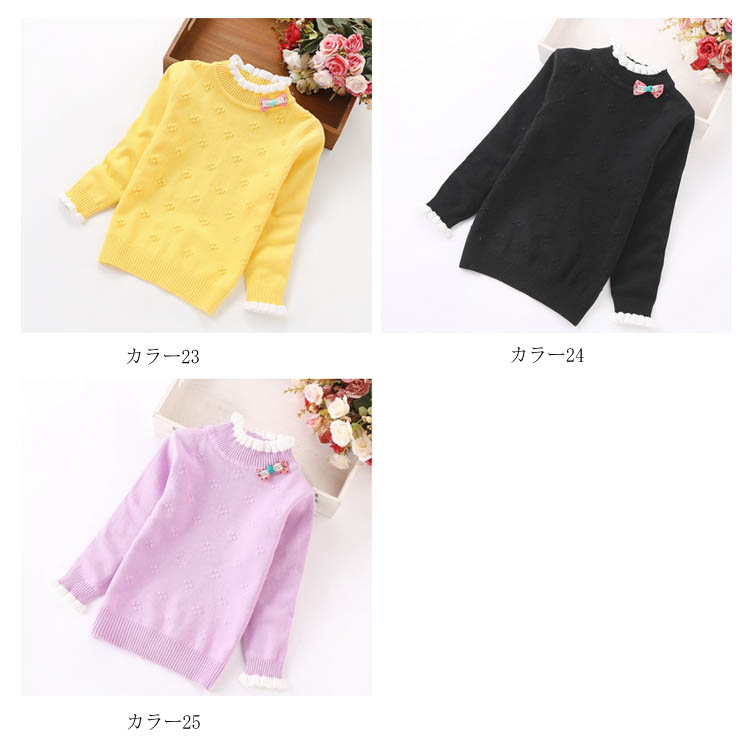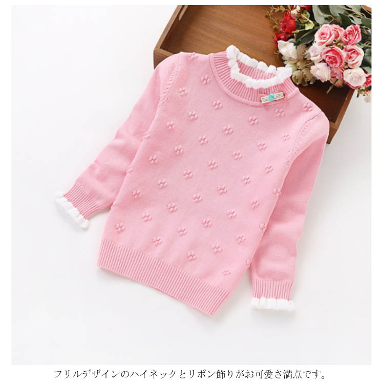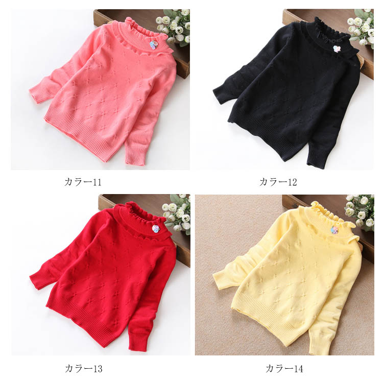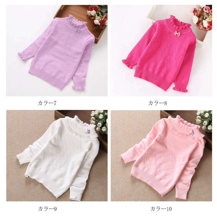 | 子供に向け超可愛い長袖ニットプルオーバーが登場です。フリルデザインのハイネックとリボン飾りがお可愛さ満点です。春秋の時、一枚だけご着用でき、冬の時インナーとして、外にジャケットやコートをカバーしても窮屈感もなし。ジーンズなどカジュアルスタイルはもちろん、レギンスやワイドパンツなど合わせても可愛いです。 | |