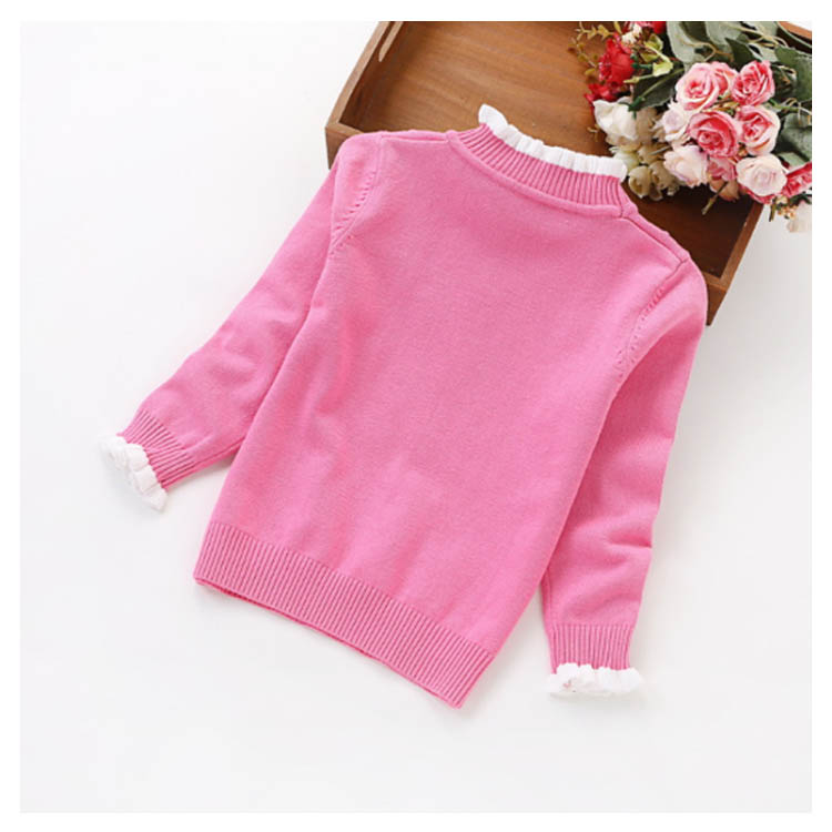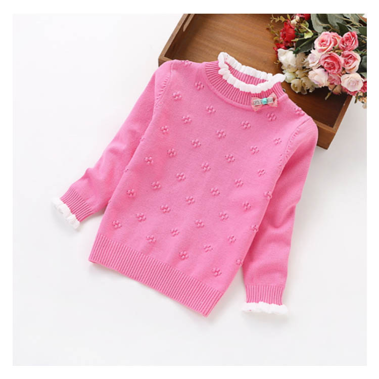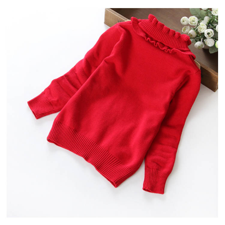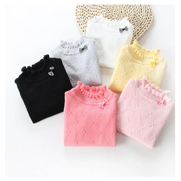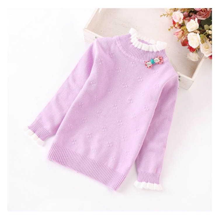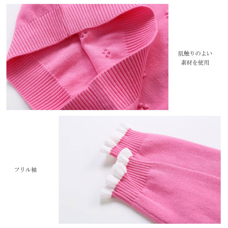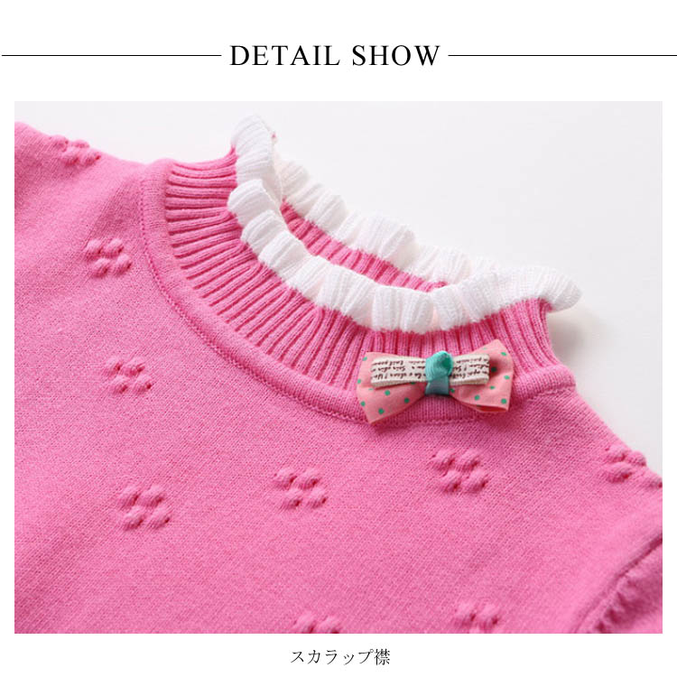 | 子供に向け超可愛い長袖ニットプルオーバーが登場です。フリルデザインのハイネックとリボン飾りがお可愛さ満点です。春秋の時、一枚だけご着用でき、冬の時インナーとして、外にジャケットやコートをカバーしても窮屈感もなし。ジーンズなどカジュアルスタイルはもちろん、レギンスやワイドパンツなど合わせても可愛いです。 | |