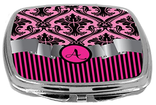 Rikki Knight Compact Mirror, Letter a Initial Hot Pink Damask and Stripes