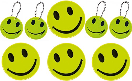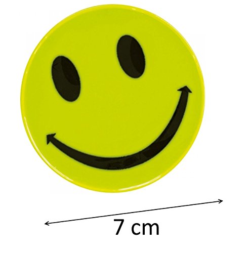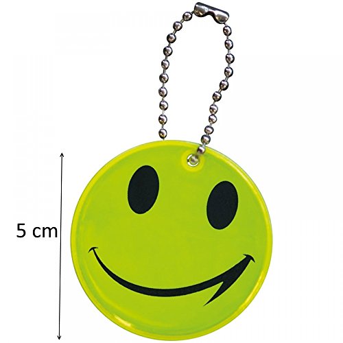 Die 2-seitigen reflektierenden Smiley Anhanger mit Ketten hat Durchmesser von ca. 5cm, die Smiley Aufkleber ca. 7cm. Die Reflektoren bringen mehr Sicherheit beim Laufen, Joggen, Radfahren, Inlineskaten oder auf dem Schulweg, bei Dammerung & Dunkelheit