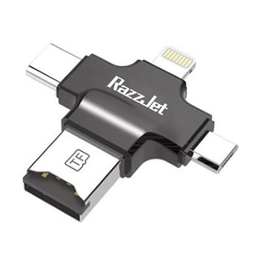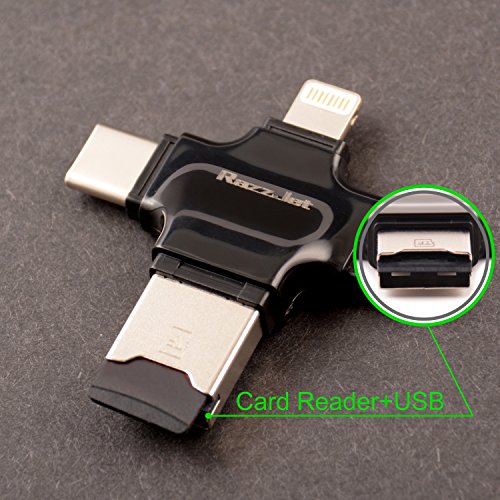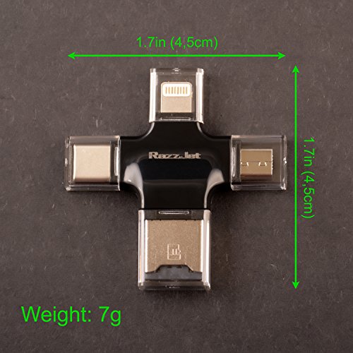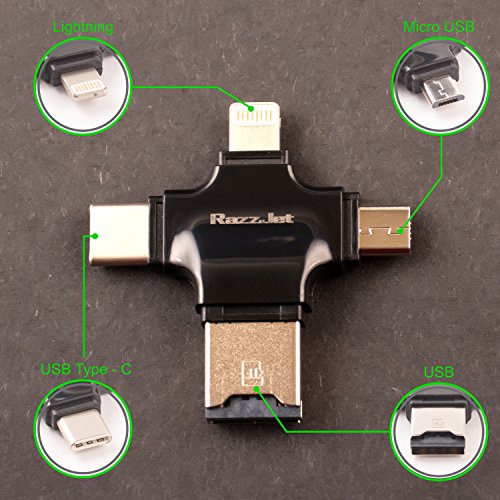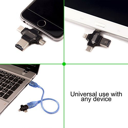 MORE OPTIONS THAN ANY OTHER CARD READER: We offer a full 4 IN ONE ports from micro USB, USB, USB-C AND a lightning port – plus you can use the usb otg cable included too to give you even more options. This usb memory stick works with EVERY device you can think off (just see the description for full details) - but please be advised that copyright protected music/video files CANNOT be transferred to this jump drive adapter