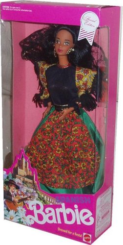 - Includes : Spanish Barbie Doll Dressed For A Fiesta with Festival Dress, Apron, Shawl, Mantilla, Stockings, Hair Decoration, Shoes, Hairbrush and Doll Stand