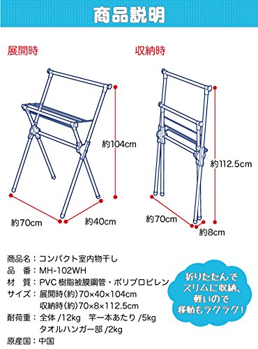 サイズ:約70.0000×49.0000×104.0000㎝ 素材:塩化ビニール樹脂被膜鋼管、ポリプロピレン 【組立品】工具不要! サイズ:約70.0000×49.0000×104.0000㎝ コンパクトに収納&簡単設置の物干しスタンド 耐荷重:全体12kg パイプ1本:5kg タオルバー:2kg