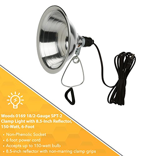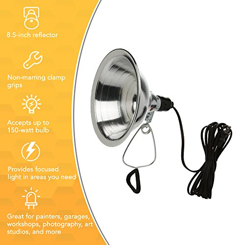 CLAMP ON LIGHTS SPECIFICATIONS: comes with 8.5 inches reflector and 6 foot cord; accepts up to 150 watts bulb (not included)