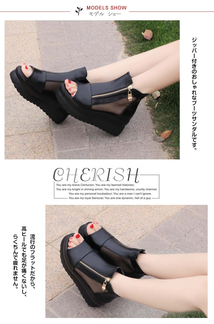 | ジッパー付きのおしゃれなブーツサンダルです。流行のフラットだから、高ヒールでも足が痛くないし、らくちんで疲れません。さらにヒール効果で、スタイルアップと女性らしさを引き立たせることが出来ます!ガーリーなコーデはもちろん、マニッシュなコーデにもピッタリ♪ | |