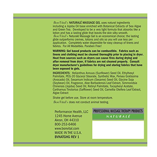 Studio : TheraBand Publisher : TheraBand Binding : Misc. Product Description Bon Vital´ Naturale Massage Gel - uses all natural ingredients including a Jojoba Oil base enriched with Botanical Extracts of Sea Algae and Green Tea. Developed to be a very light formula that absorbs like a lotion and has a lasting glide that leaves the skin silky smooth. Bon Vital´ Naturale Massage Gel is an economical choice; the lasting glide outperforms cremes, lotions and oils so you will use less per application. Completely water dispersible for easy cleanup of linens and fabrics. For All Modalities. 0