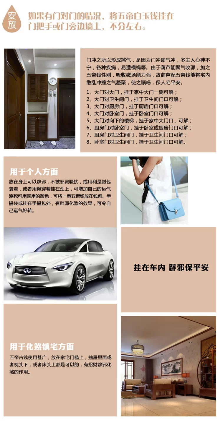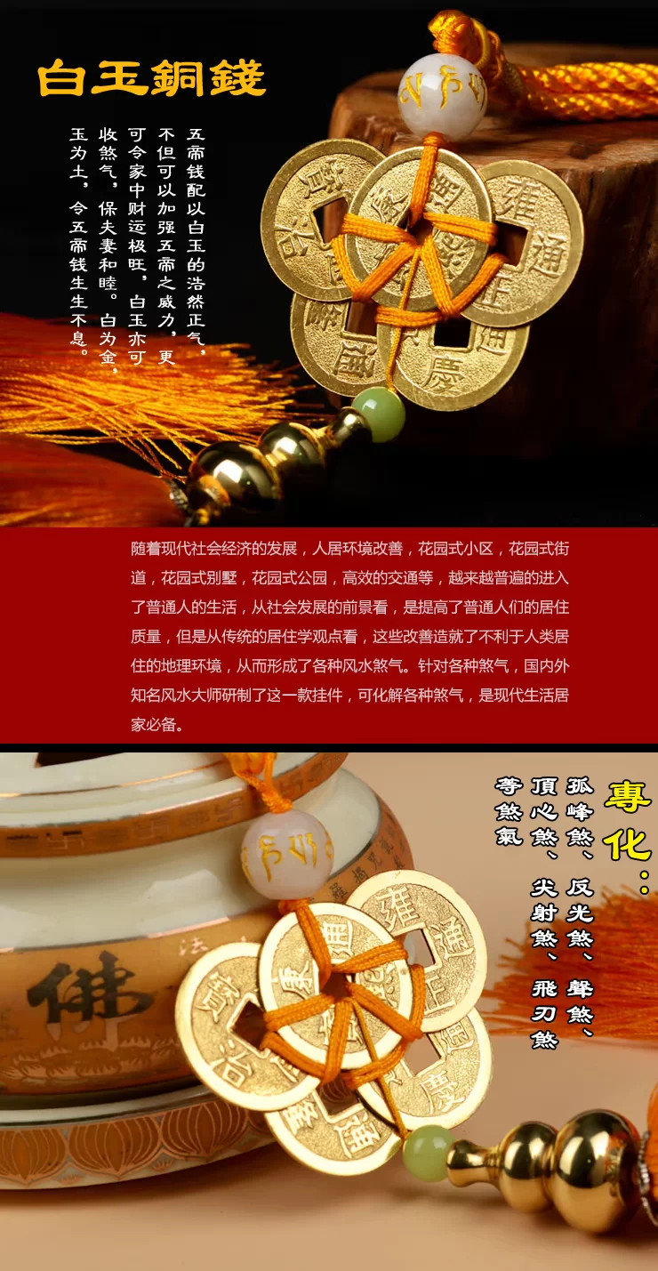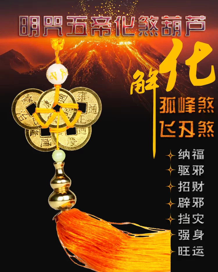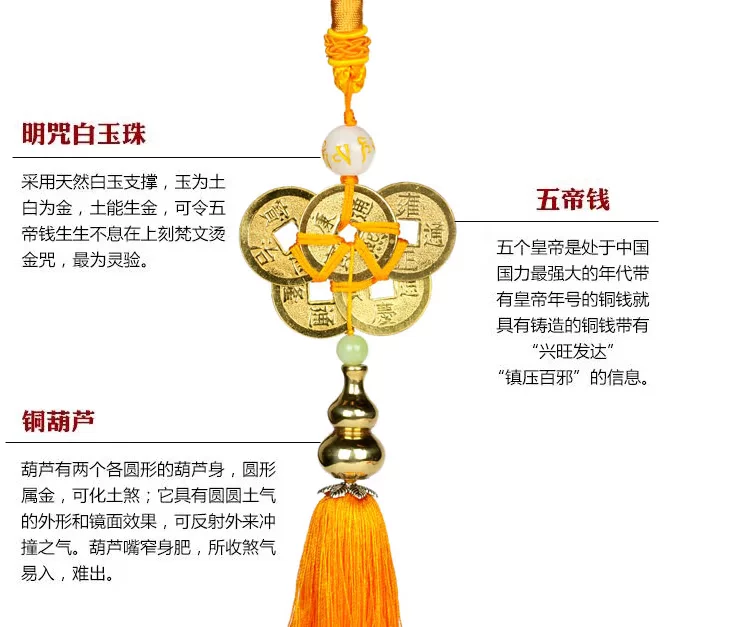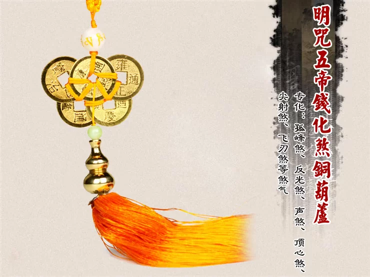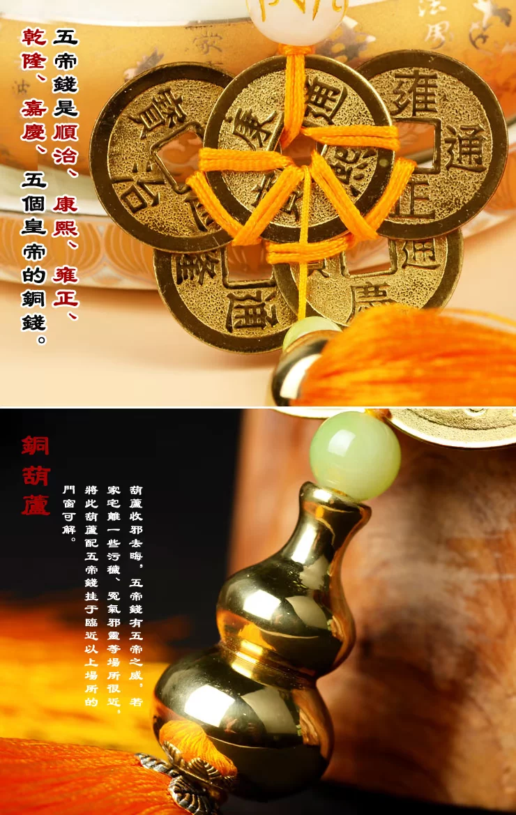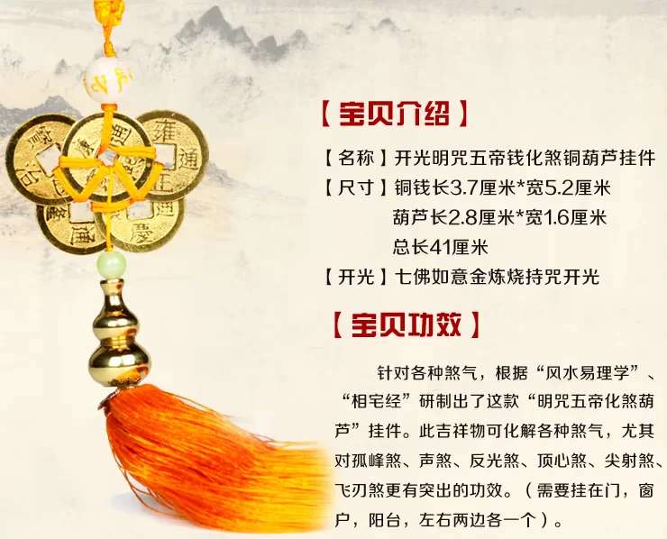 【宝贝功效】 针对各种煞气,根据“风水易理学”、“相宅经”研制出了这款“明咒五帝化煞葫芦”挂件。此吉祥物可化解各种煞气,尤其对孤峰煞、声煞、反光煞、顶心煞、尖射煞、飞刃煞更有突出的功效。(需要挂在门,窗户,阳台,左右两边各一个)