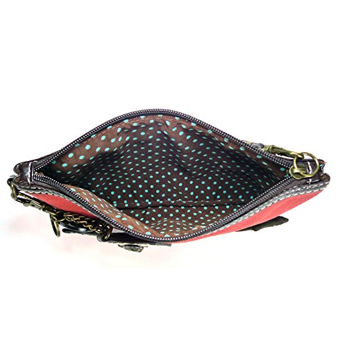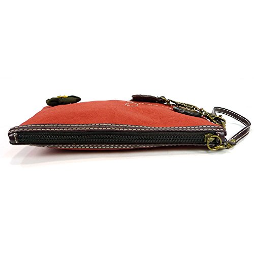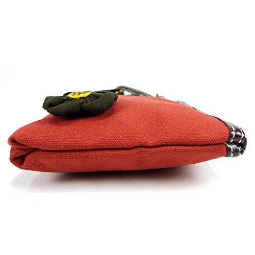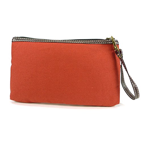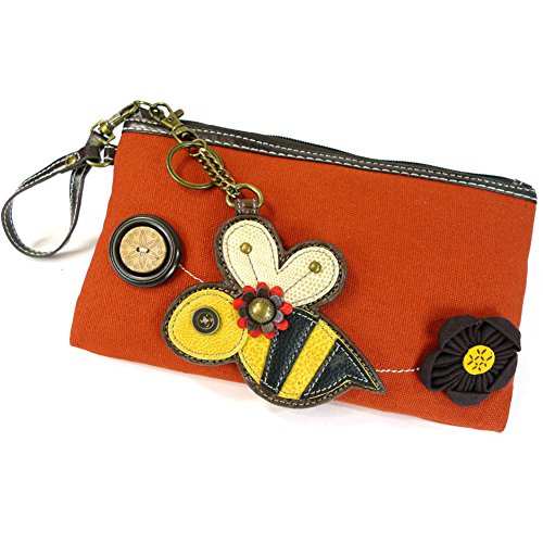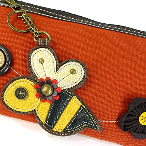-. Feature : Orange canvas clutch with bumblebee coin purse. / Top zip closure / Fabricated flower applique and detailed wood buttons / Patterned fabric lining and textured faux leather trim / Clutch Dimensions: 4.5" X 0.5" X 5.5"