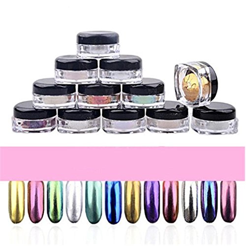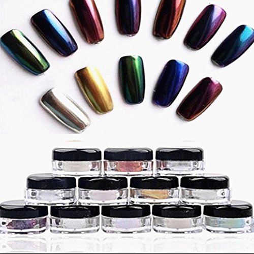 -. Feature : Set includes 12 boxes of nail glitter powders / You can also use them to decorate your home, cell phone's case, glasses, made card, body art, etc. / Nail decoration Easy to apply on natural or artificial nails / Material: Powder ; Weight: Approx.2g/box / Note:Only UV top coat can get mirror effect