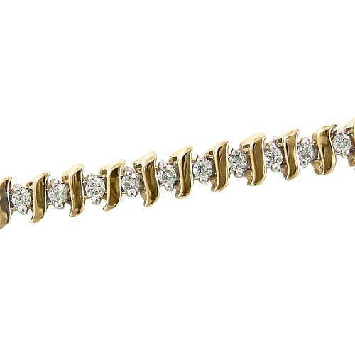 Crisp round diamonds (1 cttw) are nestled between S-shaped links of polished 10 karat gold in this gorgeous diamond tennis bracelet. This versatile accessory looks perfect with both casual and dressy outfits, and its timeless elegance ensures years of enjoyment. Choose between white or yellow gold, and select from four possible lengths: 7", 7 1/4", 7 1/2", and 8". The bracelet is finished with a traditional tongue-in-groove clasp and safety latch.Feature