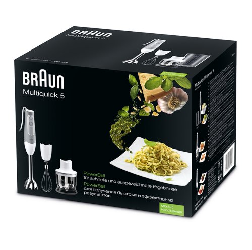 -. Feature : Produkttyp: Handmixer / Geschwindigkeit (max.): 12500 rpm / Farbe: Weiß/Grau / Besondere Merkmale: Edelstahlklinge, Turbofunktion, Geschwindigkeitseinstellungssystem, Klingenspritzschutz, BPA-frei, abnehmbare Welle, Power Bell Mixfuß / Lieferumfang: Braun MQ 525 Omelette Multiquick 5 Stabmixer