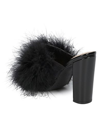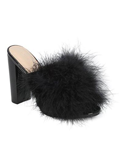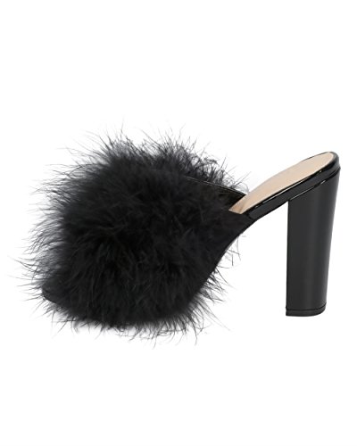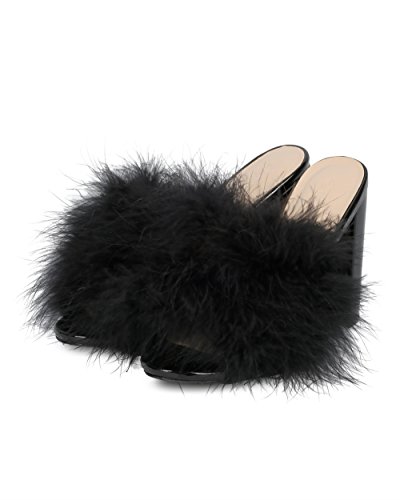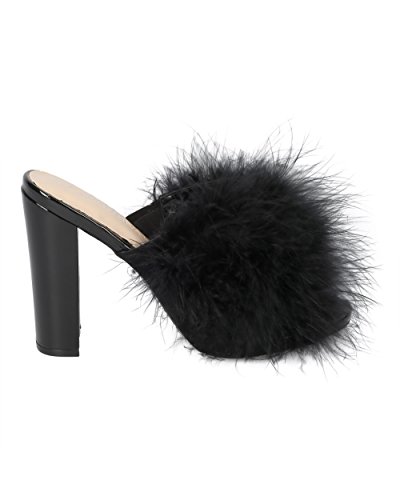 Women Feathered Block Heel Sandal - Peep Toe Fuzzy Chunky Heel Sandal - Special Occasion Dressy...