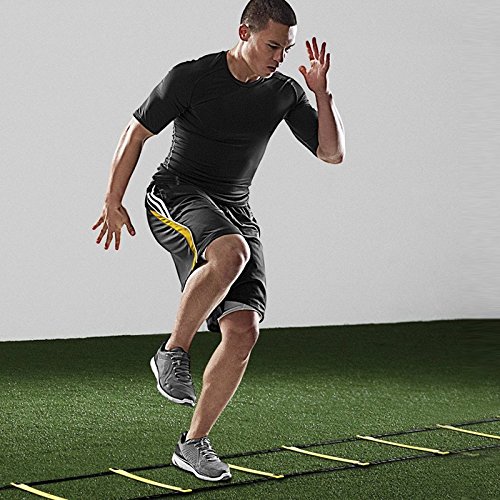-. Feature : 9 heavy duty plastic rungs can be adjusted if needed but will not move out of place during practice / Equipped with a bag for ease of carrying, portability and on-the-go training. / Simply unravel the straps and rungs to set up on surfaces for use / Flat design makes it suitable for indoor or outdoor use / Ideal tool for all athletes and trainers to improve foot speed, movement control, lateral response, coordination, overall balance and general fitness.