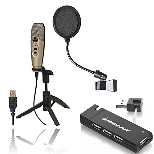 -. Feature : Large condenser microphone element for warm rich recordings, Cardioid pick-up pattern minimizes background noise and isolates the main sound source / Smooth, extended frequency response is excellent for singing, speech and instruments. Includes 10dB overload-protection switch minimizing distortion from loud sound sources ,Bass-reduction switch reduces room noise / Windows and Macintosh compatible,Great for Studio Vocals, Speech, Instruments, Podcasts, Desktop Recording, Side-address design used by broadcast, TV and recording studios / Includes Desktop Stand,10Ft. USB Cable, On Stage ASVS4B 4-Inch Pop Filter,Gooseneck supported, Easily clips onto microphon / Includes IOGEAR4-Port USB 2.0 Hub provides 4 Hi-Speed USB 2.0 ports for your USB connectivity needs