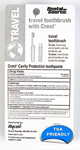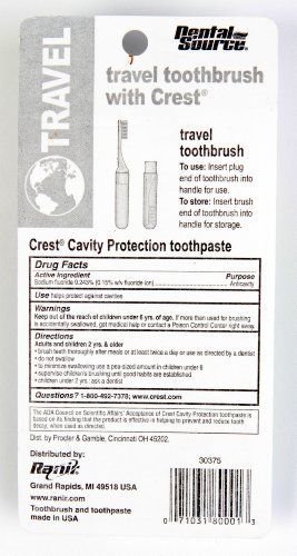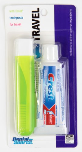 -. Brand : Dental Source -. Feature : COMPACT: Easy-to-pack travel toothbrush and toothpaste. It can comfortably fit in your bags with your travel toiletries kit. / HIGH-QUALITY: The travel toothbrush is high quality in order to give you the proper dental care. The travel toothpaste, Crest, is the most trusted toothpaste available. / LONG-LASTING: The travel toothpaste pack in the kit is large enough to serve you for an extensive number of brushings. Perfect for your short and long trips. / STORAGE: The handle of the toothbrush is foldable and can be transformed into a storage case when not in use. A remarkable travel dental tool! / BRIGHT COLOR: The toothbrush in the dental care kit comes in assorted bright colors which will vary from package to package. Order yours today! -. Label : Dental Source -. Manufacturer : Dental Source -. ProductGroup : Health and Beauty -. ProductTypeName : PERSONAL_CARE_APPLIANCE -. Publisher : Dental Source -. Studio : Dental Source -. Title : Dental Source Travel Toothbrush & Crest Toothpaste