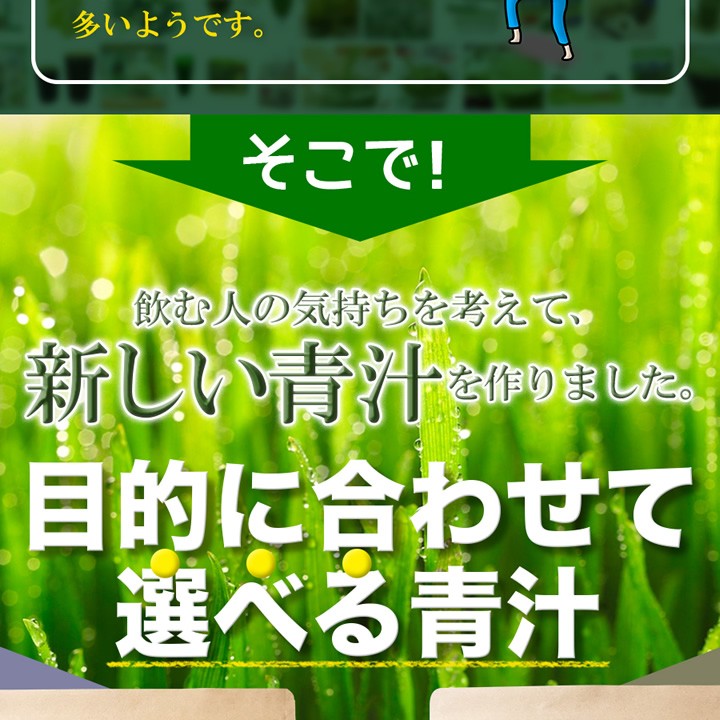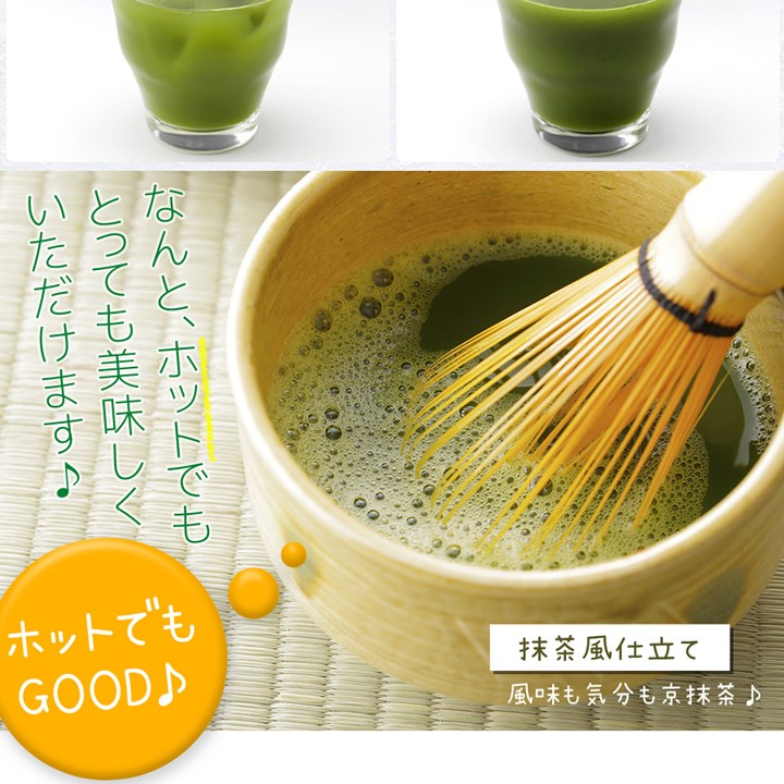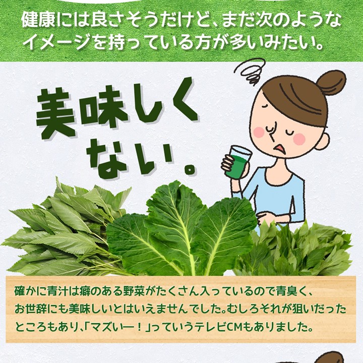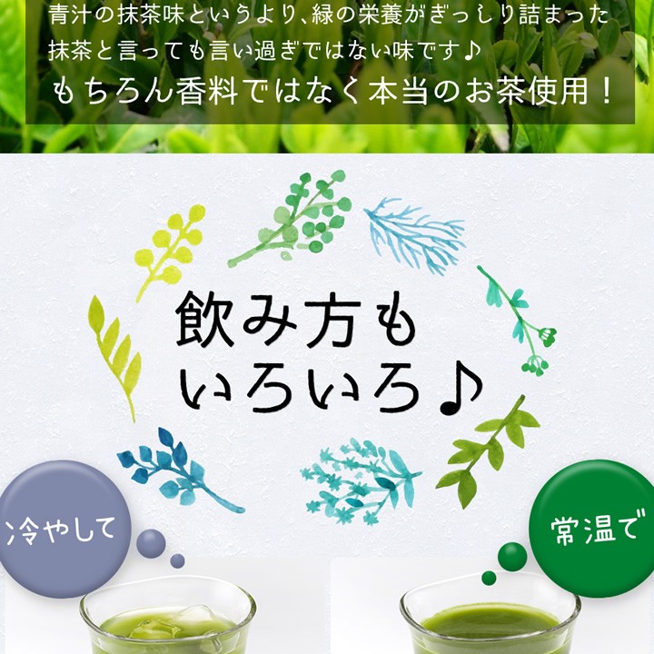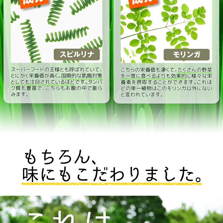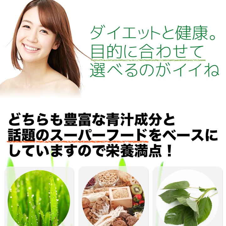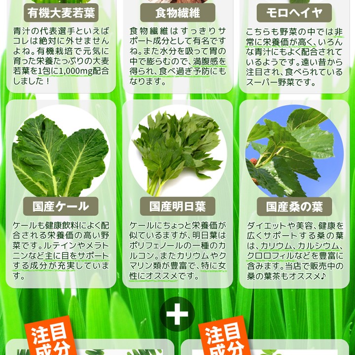 | 原材料名 | 大麦若葉末、ぶどう糖、水溶性食物繊維、スピルリナ末、抹茶末、ケール末、明日葉末、桑の葉末、シナモン末、モロヘイヤ末モリンガ末、鶏軟骨抽出物(ヒアルロン酸含有)、貝粉末(カルシウム含有)/β-カロテン、マリーゴールド抽出物(ルテイン含有)ビタミンA、ビタミンE、ナイアシン、パントテン酸Ca、ビタミンB1、ビタミンB2、ビタミンB6、ビタミンA、ビタミンD、ビタミンB12、葉酸 |
