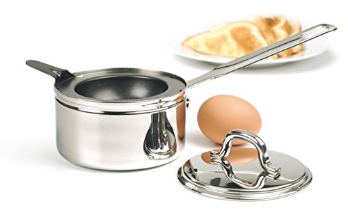 The set includes a nonstick poaching insert that cooks one egg at a time, along with a stainless steel pan with a long comfortable handle, and lid