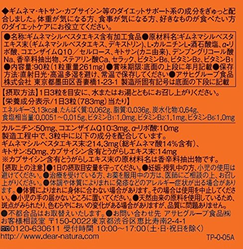 - 栄養成分 : 熱量 3.13 kcal、たんぱく質 0.062 g、脂質 0.036 g、炭水化物 0.64 g、ナトリウム 3.93 mg、ビタミンB1 1.0 mg、ビタミンB2 1.1 mg、ビタミンB6 1.0 mg、カルニチン 50 mg、コエンザイムQ10 3 mg、α-リポ酸 10 mg、 【製造時配合】ギムネマシルベスタエキス末 214.3 mg、キトサン 50 mg、カプサイシン含有とうがらしエキス末 14 mg